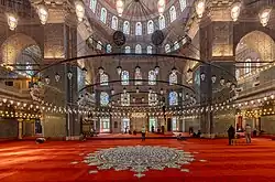 El interior de la mezquita es un cuadrado 41 metros de lado. El área central está definida por cuatro pilares que soportan la bóveda principal. En los laterales y en la parte posterior de la nave central se encuentran las columnatas formadas por hileras de delgadas columnas de mármol conectadas entre sí por arcos de diferentes estilos. La bóveda principal tiene un diámetro de 17.5 metros y una altura de 36. El espacio interior se extiende con las semi-bóvedas a lo largo del eje Este-Oeste del edificio, con bóvedas más pequeñas sobre cada esquina del cubo e incluso bóvedas más pequeñas sobre las esquinas de las galerías.