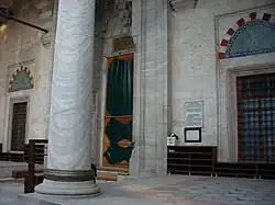 La planta interior de la mezquita es una simple sala cuadrada, de 24,5 m de cada lado, cubierta por una cúpula poco profunda de 32,5 m de altura.[4] Al igual que con Hagia Sophia, la cúpula es mucho menos profunda que un hemisferio completo. Las ventanas están decoradas con lunetos de teja seca policromada . Al norte y al sur de la sala principal, pasajes cupulados conducían a cuatro pequeñas salas también cupuladas, que estaban destinadas a funcionar como hospicios para los dervishes viajeros.