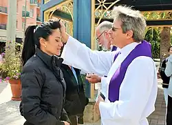 ![]() Rito de imposición de la ceniza, parte integral de la celebración litúrgica del Miércoles de Ceniza con que se inicia la Cuaresma en el rito romano. Se observa al celebrante con vestimenta de color morado, típica de este tiempo litúrgico, que simboliza la actitud penitencial. | |||||
