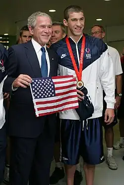 Michael Fred Phelps II[5]​ (Baltimore, Maryland, 30 de junio de 1985) es un exnadador estadounidense.[6]​ Es el deportista olímpico más condecorado de todos los tiempos, con un total de 28 medallas.[7]​ Phelps también posee los récords de más medallas olímpicas de oro (23), más medallas de oro en eventos individuales (13) y más medallas olímpicas en eventos masculinos (15) y a menudo es considerado como uno de los mejores atletas de todos los tiempos.