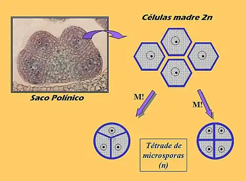 Esporas masculinas de los esporófitos, también llamadas microsporocitos. Producidas por meiosis a partir de una célula madre diploide, que forma una tétrade de microsporas haploides. Luego de la microgametogénesis, la microspora deviene en el grano de polen, que es el gametófito masculino. El grano de polen forma el tubo polínico para fecundar al saco embrionario, el gametófito femenino.