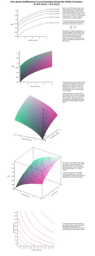 La representación gráfica más habitual presenta dos bienes alternativos X e Y (Figura 1) entre los cuales el consumidor puede elegir. Los puntos de cada curva representan las combinaciones de bienes X e Y que proporcionan la misma utilidad al consumidor.