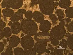 - Pisolitos: partículas esferoidales de gran tamaño, generalmente más distorsionados que los oolitos. El nombre deriva del griego pisos=guisante. Existen concentraciones minerales que pueden presentar estructuras pisolíticas: bauxitas, limonitas, sideritas y los caliches edáficos (en el ámbito subaéreo). Generalmente alcanzan 5-8 mm de diámetro y por esta razón no se les considera estrictamente microesferulitos. Dunhan (1969)[5] los asocia con los caliches, mientras Pray y Esteban (1977)[6] sugieren que se forman también a partir de precipitación inorgánica en salmueras.