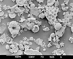 Un microfósil es un fósil que sólo se puede estudiar con lupa o mediante un microscopio óptico o electrónico de barrido, cuyos tamaños oscilan entre algunos milímetros (mm) y algunas decenas de micras (µm). Los microfósiles pueden corresponder a organismos enteros, o microbiota o a fragmentos de las partes duras de organismos de mayor tamaño o macrobiota (e.g., dientes, otolitos, espinas). Los microfósiles de animales o de sus partes se conocen como microfauna (e.g., ostrácodos, molares de micromamíferos) aunque también se emplea este término para algunos microfósiles de protistas (e.g., foraminíferos). Los microfósiles vegetales, habitualmente provenientes de la fosilización del fitoplancton reciben el nombre de microflora. La ciencia que se encarga del estudio de los microfósiles se denomina micropaleontología.