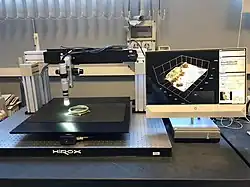 Uno de los primeros microscopios digitales fue fabricado por una empresa de Tokio , Japón , en 1986, que ahora se conoce como Hirox Co. LTD . Incluía una caja de control y una lente conectada a una computadora. La conexión original a la computadora era analógica a través de una conexión de S-video. Con el tiempo, esa conexión se cambió a Firewire 800para manejar una gran cantidad de información digital proveniente de la cámara digital. Alrededor de 2005 introdujeron unidades avanzadas todo en uno que no requerían una computadora, pero tenían el monitor y la computadora incorporados. Luego, a fines de 2015, lanzaron un sistema que una vez más tenía la computadora separada, pero conectada a la computadora por USB 3.0, aprovechando la velocidad y longevidad de la conexión USB. Este sistema también era mucho más compacto que los modelos anteriores con una reducción en la cantidad de cables y tamaño físico de la unidad en sí.