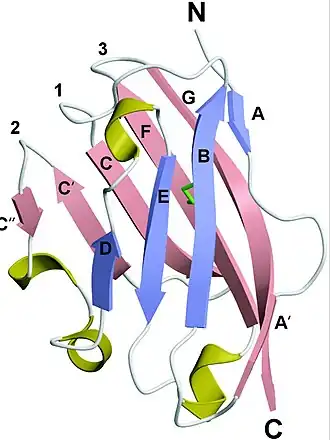 Estructura secundaria: analizada mediante el método DSSP presenta un 6% de contenido helicoidal (hélice alfa) y un 43% de lámina beta, con tres segmentos helicoidales cortos y diez láminas beta.[13]