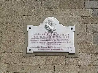 Sr. Dr. Don Miguel García Cuesta Hijo preclaro de esta villa Profesor y Rector del Seminario y Catedrático de la Universidad de Salamanca, Obispo de Jaca, Cardenal Arzobispo de Santiago de Compostela y Diputado por esta provincia en las Cortes Constituyentes de 1869. Macotera 6 de Octubre de 1803-Santiago 14 de Abril de 1873. Sus Compaisanos, 4 de septiembre de 1943'