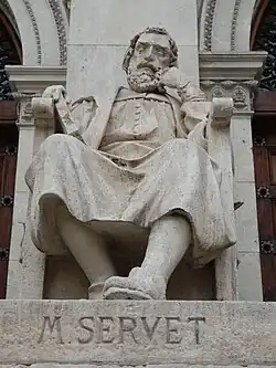 Monumento a Servet en la plaza del Ayuntamiento de Annemasse (Francia), villa situada a 4 km de Ginebra, al otro lado de la frontera franco-suiza. La inscripción bajo la escultura dice: a Miguel Servet, apóstol de las libres creencias, nacido en Villanueva de Aragón el 20 de septiembre de 1511, quemado simbólicamente en Vienne por la Inquisición Católica el 17 de junio de 1553 y quemado vivo en Ginebra el 27 de octubre de 1553 a instigación de Calvino.