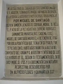 Aquí se daría su primer trabajo fue ordenado por el padre Basilio de Rivera,[7] del convento de San Agustín, quien le encargó una serie de 14 cuadros sobre la vida del santo Obispo de Hipona.[3] Esta colección, considerada una de las más importantes de la época, fue inspirada en unos grabados de Schelte à Bolswert (1624) que acababan de llegar de Europa.[7] Cada cuadro está trabajado con figuras centrales que resaltan la composición, formada de estructuras arquitectónicas, paisajes y distancias atmosféricas.[7] Tras este trabajo, Miguel de Santiago se convirtió en uno de los favoritos de los agustinos, y le valió fama también entre las familias más acaudalados de la época.