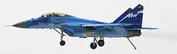 MiG-29K en la exhibición MAKS de 2007 simulando un apontaje con el gancho de parada desplegado.MiG-29K de la Fuerza Aérea India con las alas plegadas.Variante naval basada en el MiG-29M en la que la letra ‘K’ hace referencia a la expresión rusa ‘Korabelnogo bazirovaniya’, que significa «basado en buques». Incorpora modificaciones para operar como avión embarcado como las alas plegables, un gancho de parada, y un tren de aterrizaje reforzado. Originalmente planeado para los portaaviones de la clase Almirante Kuznetsov, había recibido la aprobación del Ministerio de Defensa Ruso para su producción en serie pero el programa fue paralizado en 1992 debido al cambio en la doctrina militar rusa y problemas financieros del estado.[12] No obstante, en 1999 la Corporación MiG relanzó el programa realizando mejoras vitales al diseño previo. El 20 de enero de 2004 la Marina India firmó un contrato por 12 monoplazas MiG-29K y 4 biplazas MiG-29KUB.[12] Las modificaciones hechas a petición de la Marina India son ahora el estándar de toda la producción, y aunque es confuso, por compartir la designación, esta tiene diferencias notables en electrónica con el MiG-29K promisorio. Las versiones MiG-29K y MiG-29KUB actualmente producidas comparten una misma cubierta de cabina de tamaño biplaza. El MiG-29K cuenta con revestimientos absorbentes de radar para reducir la firma radar del avión. Las pantallas de la cabina consisten en una pantalla de visualización frontal HUD y tres pantallas multifunción LCD a color (siete en el biplaza MiG-29KUB) con el sistema de puntería montado en casco Topsight E. Dispone de una gama de armamento totalmente compatible con las versiones MiG-29M y MiG-29SMT.[13] Su designación OTAN es "Fulcrum-D".