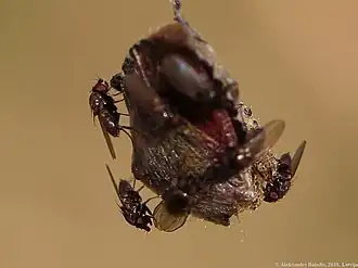 Los adultos de algunas especies rondan a depredadores, como arañas y miembros de la familia Reduviidae y se comportan como cleptoparásitos. Parecen alimentarse de los fluidos de la víctima.[7]