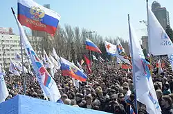 El 3 de marzo de 2014, durante los disturbios prorrusos de 2014 en Ucrania, grupos de manifestantes tomaron el control del edificio de la administración regional en Donetsk.[18]​ En él participó un grupo armado de oposición recién creado, denominado Milicia del Pueblo del Dombás, dirigido por Pável Gubárev.[18]​ Esto sucedió cuando 11 ciudades ucranianas con poblaciones significativas de personas de etnia rusa estallaron en manifestaciones contra el nuevo gobierno ucraniano.[18]​ El 6 de abril de 2014, 2000 manifestantes prorrusos se manifestaron frente al edificio de la administración regional.[19]​ El mismo día, grupos de manifestantes en el este de Ucrania asaltaron el edificio de la administración regional en Járkov y la sede de la SBU en Lugansk.[5]​ Los grupos crearon un consejo popular y exigieron un referéndum como en Crimea.[19][20][21][22][23][24][25][26]​ A los pocos días, varios edificios gubernamentales en ciudades como Kramatorsk y Sloviansk también fueron asaltados. El 12 de abril, los partidarios de la República Popular de Donetsk y miembros de la Milicia Popular de Dombás instalaron puestos de control y barricadas en Sloviansk. El mismo día, exmiembros de la unidad "Berkut" de Donetsk se unieron a las filas de la Milicia Popular del Dombás.[27][28][29][30][31][32][33]