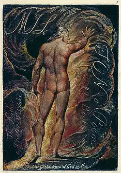 El Milton de Blake se imprimió usando su característica combinación de texto grabado e ilustración, complementada con acuarela.[4]