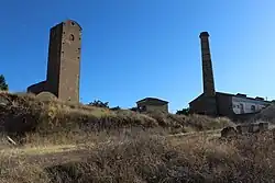 Esta chimenea servía para evacuar los humos de los Pozos San Federico y Santa Annie. Se construye con arenisca que se remata mediante ladrillos.