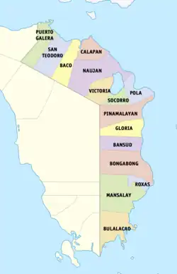 El 13 de junio de 1950, la provincia de Mindoro se divide en dos porciones: Oriental y Occidental.[3] La provincia Oriental comprendía los siguientes once municipios: Baco, Bongabón, Bulalacao, Calapan, Mansalay, Naujan, Pinamalayan, Pola, Puerto Galera, Roxas, y San Teodoro.