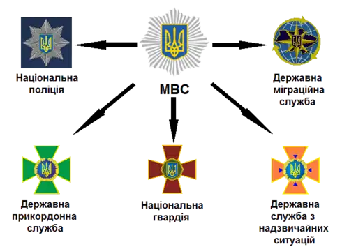 El Ministerio del Interior de Ucrania es el principal órgano del sistema de órganos ejecutivos centrales sobre la formación y aplicación de la política del Estado en la esfera de la protección de los derechos y libertades de los ciudadanos, los intereses de la sociedad y el Estado contra las invasiones ilegales, la lucha contra la delincuencia, la protección del orden público, la garantía de la seguridad pública, la seguridad vial, la protección y la defensa de instalaciones estatales particularmente importantes.