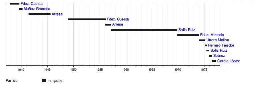 El cargo quedó temporalmente vacante. No obstante, el vicesecretario general de aquel momento, Rodrigo Vivar Téllez, quedó oficialmente a cargo de la Secretaría general y se hizo con las riendas de Falange.[5]​ No sería hasta 1948 cuando se volvió a nombrar a un secretario general —nuevamente Fernández-Cuesta—, aunque no sería hasta 1951 cuando volviera a recuperar su rango ministerial.[6][7]​ Arrese volvió a asumir brevemente la secretaría general, hasta que en 1957 se nombró a José Solís Ruiz para ocupar el cargo.[8]​ Fue a partir de esta época cuando se abandonó el uso del término FET y de las JONS en favor del más impreciso «Movimiento» para referirse al cargo.[9]​ Durante los siguientes años Solís concentró un gran poder en sus manos, ya que además de dirigir el «Movimiento nacional», también era delegado nacional de Sindicatos.