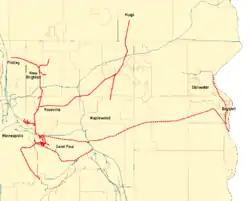 ![]() Mapa de la red ferroviaria alrededor de las Twin Cities. Las líneas sólidas son propiedad de Minnesota Commercial y las líneas azules son otros ferrocarriles. | ||
