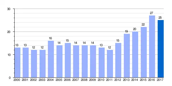| Gráfica de evolución demográfica de Mioma[3] entre 2000 y 2017 |