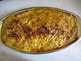 El plato consiste en berenjenas sazonadas con ajo, tomate, cúrcuma, aceite o mantequilla, sal y pimienta unidas con huevos.[2] Se puede preparar como un plato de cazuela, y generalmente se sirve con pan o arroz. La variante hecha con calabacín en lugar de berenjena se llama Kadoo Ghassemi.[2]