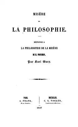 La miseria de la filosofía (también conocido: Miseria de la filosofía: Respuesta a Filosofía de la miseria del señor Proudhon; del original francés: Misère de la philosophie. Réponse à la philosophie de la misère de M. Proudhon) es un polémico libro de Karl Marx publicado en París y Bruselas en 1847, donde vivió en el exilio desde 1843 hasta 1849. Fue escrito originalmente en francés como una crítica de los argumentos económicos y filosóficos expuestos por el anarquista francés Pierre-Joseph Proudhon en su libro Sistema de las contradicciones económicas o Filosofía de la miseria.[1][2]​ Aunque en su título aparece la palabra "filosofía", esencialmente un libro es que trata el tema de la crítica de la economía política. En él, Marx critica el análisis económico de Proudhon como idealista al considerar los conceptos o categorías económicas como "leyes eternas" en lugar de ser producto de las relaciones de producción. Según Marx, hay que salir de la filosofía para analizar el mundo en la nueva perspectiva de la economía política, basada en el deseo de cambiar la sociedad. La filosofía debe ser el arma intelectual del proletariado.
