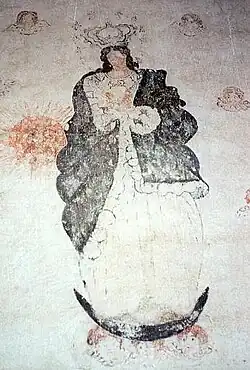 En 1966 la decoloración de las blancas paredes, dejaron ver unos murales que se estiman son del siglo XIX, sobre la Virgen María, los evangelistas, la pasión de Cristo, la figura del diablo, la de un esqueleto y algunas letras.[4] Unas serpientes forman los lados verticales de uno de los marcos y del lado horizontal superior es rematado con triángulos con cabezas y tocados ceremoniales. Algunos otros símbolos no han sido descifrados.