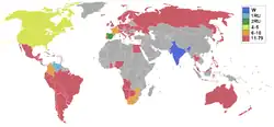 | Retirados | Austria, Bonaire, Curazao, Guyana, Islas Cook, Islas Vírgenes de los Estados Unidos, Nicaragua, Surinam, Turquía, Zambia | |