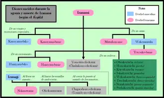 - Al nacer Kagustuchi, los genitales de Izanami fueron quemados y fue herida mortalmente. En su agonía, de sus vómitos, orina y heces también nacieron más dioses.