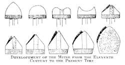 Las antiguas representaciones gráficas de mitras y los ejemplares auténticos que se conservan de esta prenda desde el siglo XIII nos dan a conocer las sucesivas evoluciones de la misma que se produjeron de la siguiente forma: