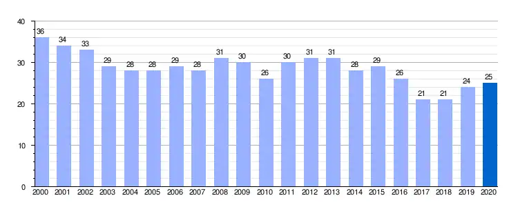 | Gráfica de evolución demográfica de Moarves de Ojeda entre 2000 y 2020 |