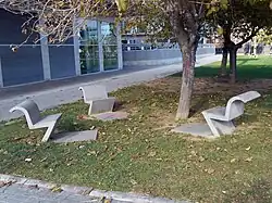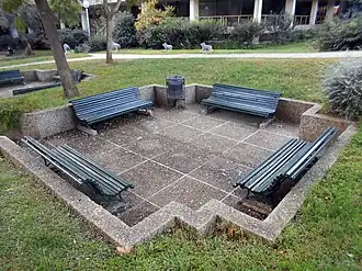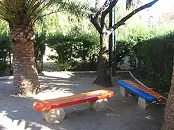 - Bancos: sirven para sentarse e incluye bancos, banquetas (bancos sin respaldo), butacas, sillas (butacas sin respaldo), taburetes y tumbonas. Pueden ser de piedra, madera, hierro u hormigón, con modelos como Romántico, Neorromántico, Neobarcino, Mediterráneo, Catalano, Montseny, Levit, U, Cadira Nigra, Boston, Sumo, Nu, Marina, Diputació, Koro, G, Alpino, Sócrates, Hebi, Lungomare, Sillarga, Sicurta o Modular.[31]