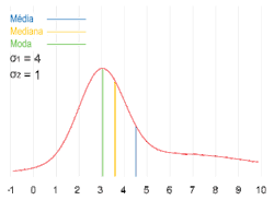 Ilustración del comportamiento de las medidas de tendencia central en una distribución asimétrica positiva (por ejemplo, una distribución chi-cuadrado) cuando se altera la dispersión de los datos. La curva roja describe la densidad de probabilidad de los datos en el espacio muestral, la línea azul (derecha) representa la media, la línea amarilla (centro) representa la mediana y la línea verde (izquierda) representa la moda del conjunto de datos.