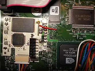 - Modchips LPC: Es un tipo exclusivo de chips de Xbox, utilizado principalmente por sus usuarios. A diferencia de los primeros modchips que se soldaban directamente a la BIOS, utiliza un método diferente para reemplazarla y su instalación es mucho más sencilla.