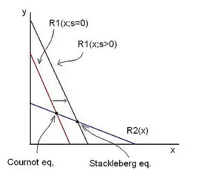 - ↑ Se necesitan supuestos matemáticos adicionales en la función recíproca de la demanda y las funciones de costos para asegurar que las condiciones susodichas definen un máximo y que la pendiente de las funciones de reacción es descendente (elecciones son "sustitutos estratégicos") y que se cruzan. El gráfico ilustra el caso de la demanda lineal de la forma .