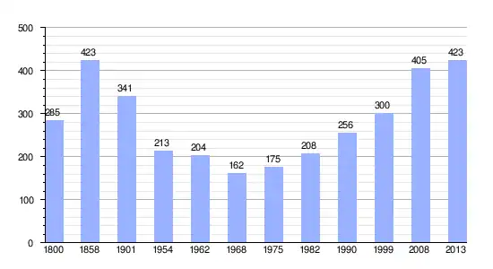 Los datos demográficos contemplados en este gráfico de la comuna de Mognard[4] se han cogido de 1800 a 1999 de la página francesa EHESS/Cassini, y los demás datos de la página del INSEE.[5]