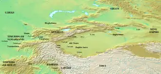 En el siglo XIV Timur envió al menos cinco expediciones victoriosas a Mogolistán, debilitando seriamente el régimen de Qamar ud-Din. Los mogoles habían enviado una súplica sin éxito al emperador chino Hongwu pidiendo ayuda, ya que Timur había querido también conquistar China.[1] A pesar de que la alianza militar no resultó, la dinastía Ming abrió el comercio a las caravanas hasta Mogolistán, muy enriquecedor para los gobernantes mogoles que recaudaban zakat (impuesto) en el lucrativo comercio de la ruta de la seda.[8] Este comercio marcó el comienzo de una era de intercambio económico y cultural con China, a cambio de la aceptación del estado (que los Ming veían como tal) de estatus tributario de los Ming.[3] Durante el siglo XV los mogoles tuvieron que lidiar con varias incursiones enemigas de oirates, timúridas y uzbekos. Yunus Khan (1462-1487) se benefició de la debilidad de sus vecinos y tomó Tashkent en 1482. Hacia el final del reinado de Yunus, su hijo Ahmad Alaq fundó un kanato separatista en el gran Turfán.