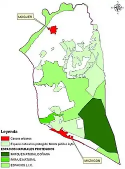 Su término municipal es colindante con la costa atlántica, que se sitúa en el límite meridional, con barrancos de arenisca aluvial, y alturas entre 10 y 30 m. En ellos se forman dunas. La vegetación predominante es el barrón, las camarinas, la retama blanca, el jaguarzo.