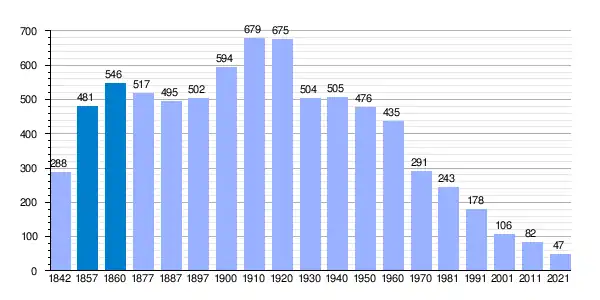 | Gráfica de evolución demográfica de Molezuelas de la Carballeda[10] entre 1842 y 2021 |