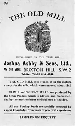 - ↑ «OLD MILL IN YARD AT NUMBER 51, BLENHEIM GARDENS SW2 (south off), BRIXTON, LAMBETH, GREATER LONDON». English Heritage. Archivado desde el original el 9 de octubre de 2012. Consultado el 18 de mayo de 2008.