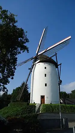- Con el techo giratorio montado sobre torres cilíndricas (también en ocasiones troncocónicas) de ladrillo o piedra, tanto redondas como poligonales. Son denominados Torenmolen en los Países Bajos ("molino de torre"). Con una torre ligeramente cónica se pueden citar el molino de Dreher en Lienden (De Zwaan, 1644),[12] dos en Zeddam (De Grafelijke Korenmolen, 1441) y Zevenaar (De Buitenmolen, 1450) y uno (en Eijsden-Gronsveld (van Gronsveld, 1623).