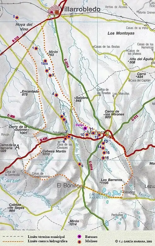 | 13 | Molino los Atienzas | 544150 | 4320800 | 889 | Munera | Córcoles | DCHA. | |