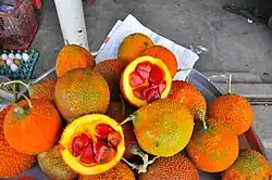 Los frutos son ovoides a ampliamente elipsoides, de unos 15 centímetros de largo por 10 centímetros de diámetro y están cubiertos de numerosas espinas pequeñas en la piel.[1][2][3][4][5] Inicialmente son verdes, pero se vuelven de un color rojo anaranjado intenso al madurar y contienen numerosas semillas de forma irregular de color marrón o gris que están encerradas en un arilo rojo brillante.[1][2][3][4][5]