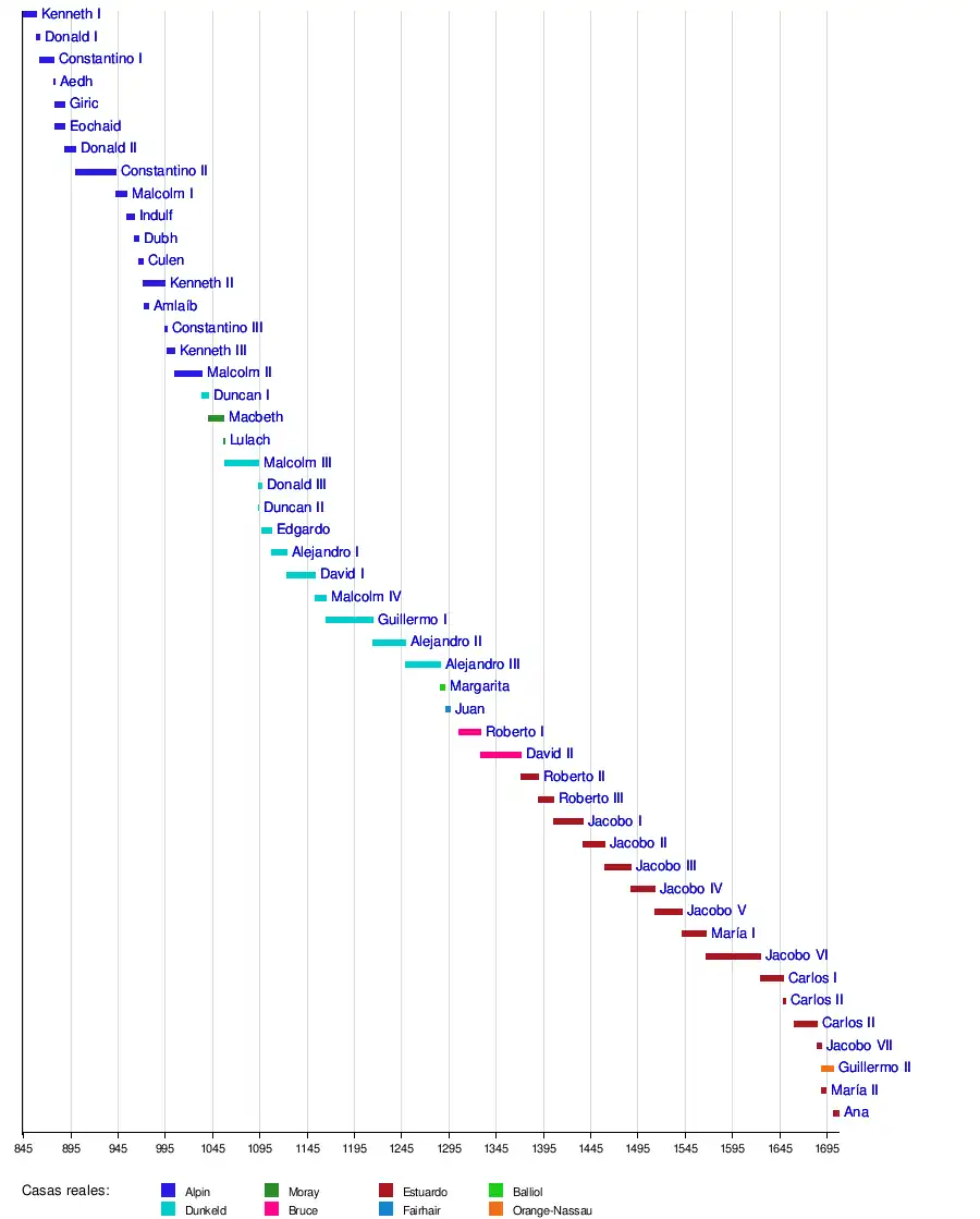 Ana de Gran BretañaMaría II de InglaterraGuillermo III de InglaterraJacobo II de InglaterraCarlos II de InglaterraCarlos II de InglaterraCarlos I de InglaterraJacobo I de InglaterraMaría I de EscociaJacobo V de EscociaJacobo IV de EscociaJacobo III de EscociaJacobo II de EscociaJacobo I de EscociaRoberto III de EscociaRoberto II de EscociaDavid II de EscociaRoberto I de EscociaJuan de BalliolMargarita I de EscociaAlejandro III de EscociaAlejandro II de EscociaGuillermo I de EscociaMalcolm IV de EscociaDavid I de EscociaAlejandro I de EscociaEdgardo de EscociaDuncan II de EscociaDonald III de EscociaMalcolm III de EscociaLulach de EscociaMacbeth de EscociaDuncan I de EscociaMalcolm II de EscociaKenneth III de EscociaConstantino III de EscociaKenneth II de EscociaCulen de EscociaDubh de EscociaIndulf de EscociaMalcolm I de EscociaConstantino II de EscociaDonald II de EscociaEochaid de EscociaGiric de EscociaAedh de EscociaConstantino I de EscociaDonald I de EscociaKenneth I de Escocia