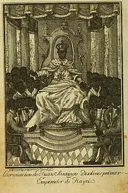 Toda la isla La Española fue reclamada por primera vez el 5 de diciembre de 1492 por Cristóbal Colón, para la reina Isabel la católica, y se estableció el primer virrey de las Américas (Virreinato colombino) junto con varias colonias en toda la isla. Con el posterior descubrimiento de México y Perú muchos de los primeros pobladores partieron hacia tierra firme, pero quedaron unas doce ciudades y cien mil almas, principalmente en la parte oriental de la Isla. A través del Tratado de Riswick en 1697, el rey Luis XIV recibió el tercio occidental de la isla de España como retribución y formalizó el primer asentamiento pirata francés existente desde mediados del siglo XVII,[46] con la colonia administrada por un gobernador general que representaba la corona francesa,[47] un acuerdo que se mantuvo hasta que la Revolución Francesa derrocó la monarquía de Francia el 21 de septiembre de 1792. Aunque el gobierno francés retuvo el control sobre la región de Saint-Domingue, el 22 de septiembre de 1804, Jean-Jacques Dessalines, que había servido como gobernador general de Saint-Domingue desde el 30 de noviembre de 1803, se declaró jefe de un independiente Imperio de Haití, y su coronación como emperador Jacques I tuvo lugar el 6 de octubre de ese año. Después de su asesinato el 17 de octubre de 1806, el país se dividió por la mitad y la parte norte finalmente se convirtió en el Reino de Haití el 28 de marzo de 1811, con Henri Christophe instalado como rey Enrique I.[48] Cuando el rey Enrique se suicidó el 8 de octubre de 1820, y su hijo, Jacques-Victor Henry, Príncipe Real de Haití, fue asesinado por revolucionarios diez días después, el reino se fusionó con la República de Haití, en el sur, de la que Faustin-Élie Soulouque fue elegido presidente el 2 de marzo de 1847. Dos años más tarde, el 26 de agosto de 1849, la asamblea nacional haitiana declaró presidente al emperador Faustin I, restableciendo así el Segundo Imperio de Haití. Pero esta reencarnación monárquica también duró poco, ya que estalló una revolución en el imperio en 1858, lo que provocó que Faustin abdicara del trono el 18 de enero de 1859.[49]
