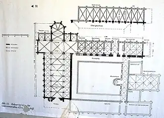 La construcción del edificio principal de piedra comenzó un poco más tarde, probablemente entre 1220 y 1230. La construcción se planificó en dos etapas, separadas por la Gran invasión de los mongoles de 1241. En la primera etapa de la construcción, los elementos principales son de influencia románica. Se trazó el plan general y se levantaron los muros hasta una altura de unos 3-4 metros. En 1260, las obras se reiniciaron bajo un nuevo arquitecto formado en la madurez arquitectura gótica, con la ayuda de un nuevo taller de albañiles. Durante este período, el antiguo oratorio de piedra fue desmantelado y en sus cimientos se construyó una parte del ala norte del crucero y una parte del coro con el poligonal ábside.[2]