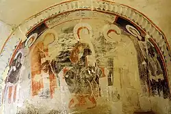 El fresco del altar central ilustra la «Bendición de Jesús», sosteniendo un libro cerrado con un alfabeto georgiano en la mano izquierda. También se muestran algunos de los arcángeles como Miguel y Gabriel, así como querubines.[9]