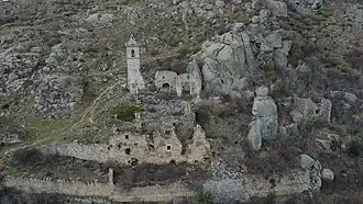 Actualmente sólo quedan en pie la torre del campanario, el arco de entrada de la antigua iglesia, parte del ábside (oculto por la vegetación) y restos de los muros de diferentes dependencias.