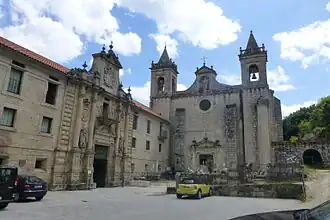 Los edificios monacales se ordenan alrededor de tres claustros, el claustro de los Caballeros al que se denomina también de la portería o Grande, el de los Obispos y el claustro pequeño o del Vivero (en gallego do Viveiro). Destaca la soberbia portada barroca que junto a la iglesia y el pequeño cementerio conforman la entrad principal del conjunto monacal.