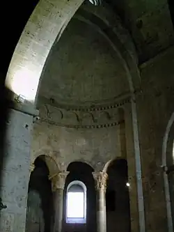 La iglesia renovada en el año 1160 es de planta basilical con tres naves y un gran ábside central con deambulatorio. La nave central está cubierta con bóveda de cañón y las laterales con bóvedas de cuarto de círculo. El crucero tiene bóveda de medio punto y el ábside semicircular de cuarto de círculo.