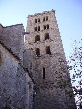 Se conserva muy poco de la construcción románica original. El antiguo campanario de la iglesia, construido en el siglo XI, es el edificio mejor conservado. Se trata de una esbelta torre de una altura de 32 metros y de planta rectangular. Consta de cinco pisos con ventanas en los cuatro superiores.